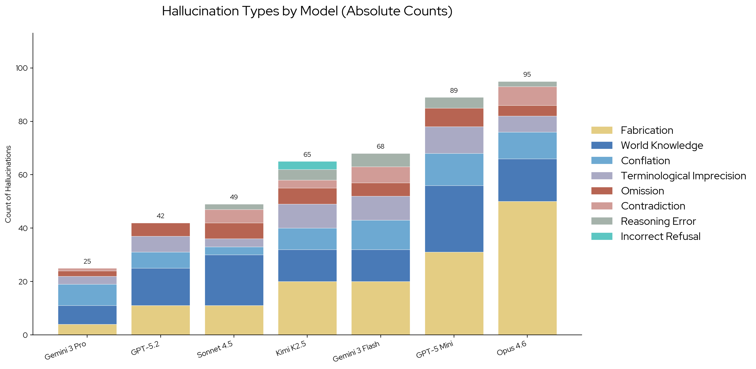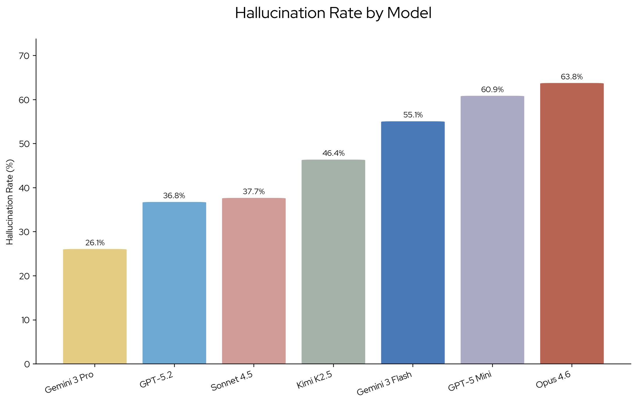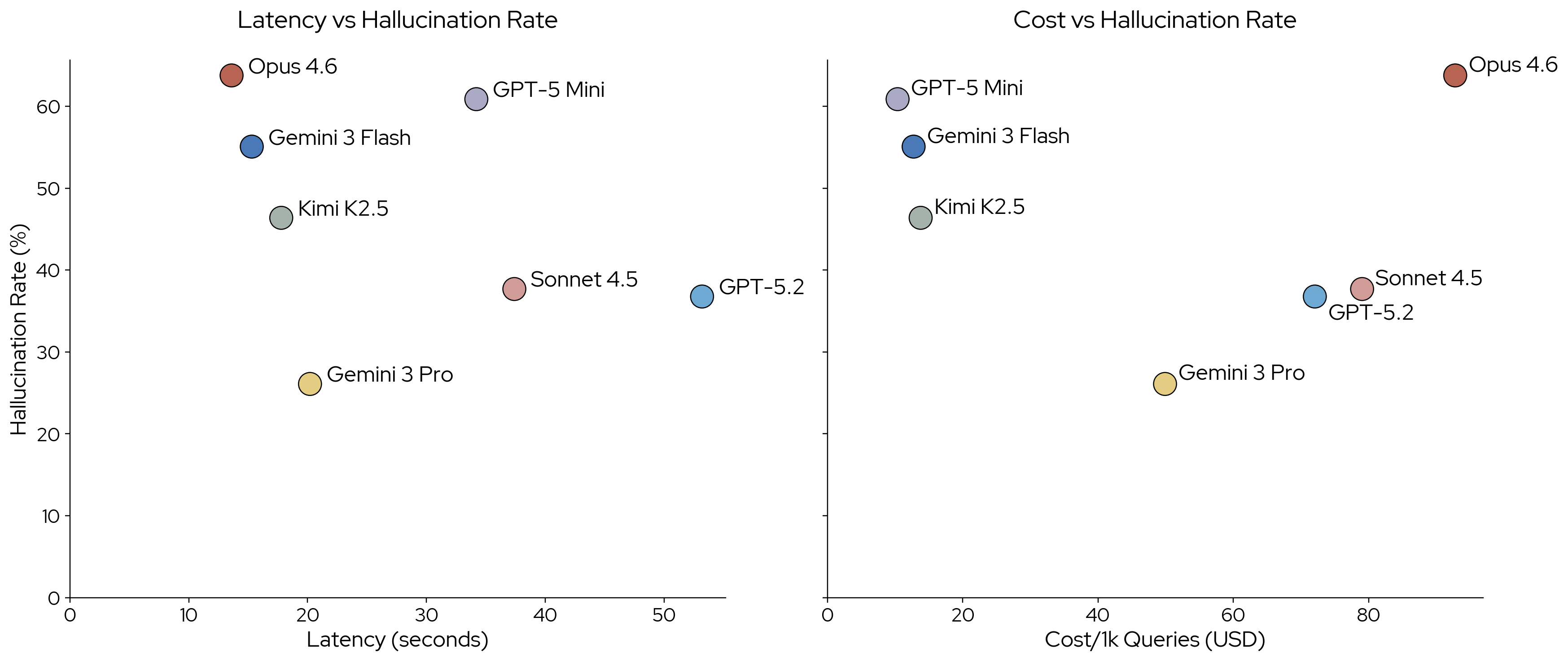 The results also show that general-purpose benchmark performance does not predict domain-specific reliability. Opus 4.6, one of the highest-ranked models on coding and reasoning leaderboards, produced the highest hallucination rate in our evaluation. Gemini 3 Pro, on the other hand, achieved the lowest hallucination rate while also being among the most cost-efficient flagship models.