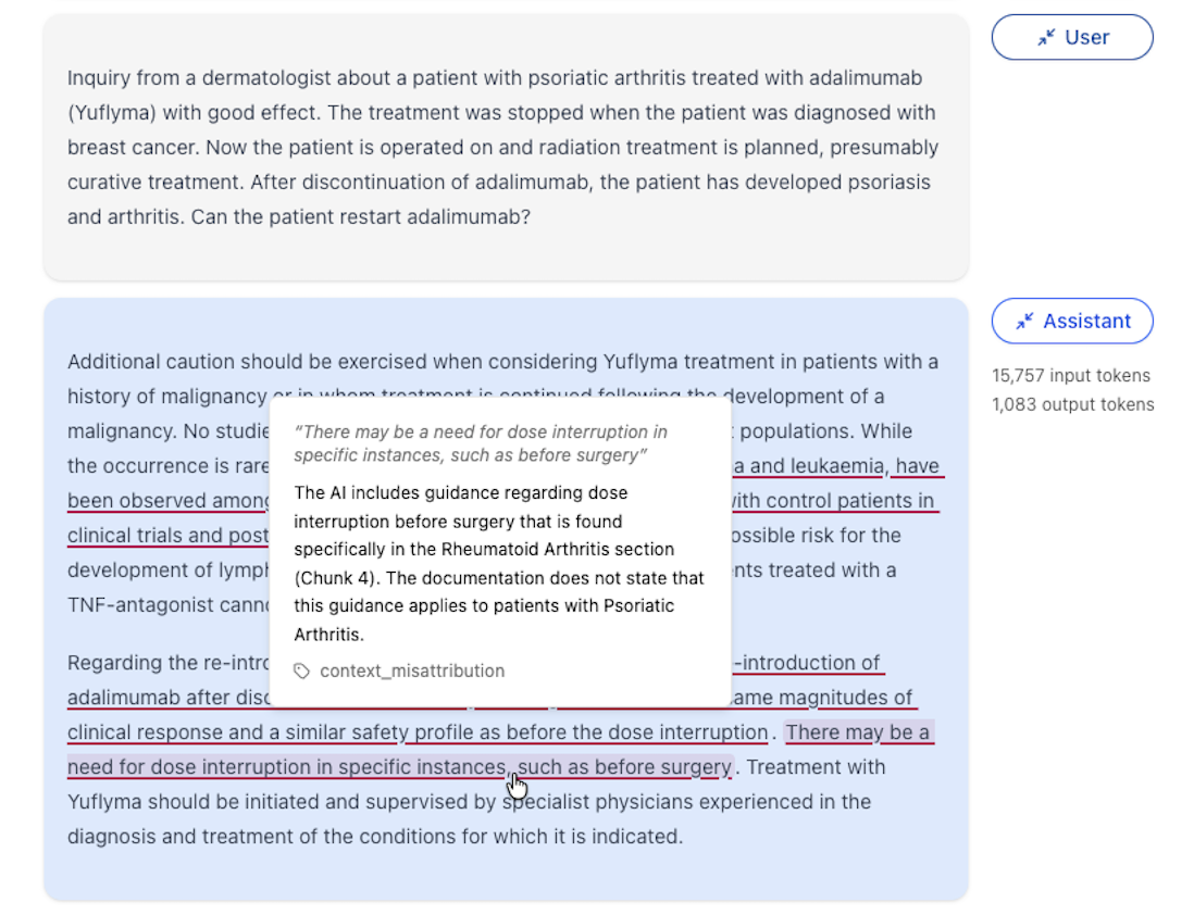 The Blue Guardrails platform gives annotators a unified view of each trace: the user query, the retrieved document chunks with their metadata, and the LLM's response side by side. Crucially, our annotations operate at the claim level, not the message level. Rather than labeling an entire response as "hallucinated" or "faithful," we select the exact span of text that contains an error and categorize it individually. This allows us to identify exactly where and how a model fails within a single response.