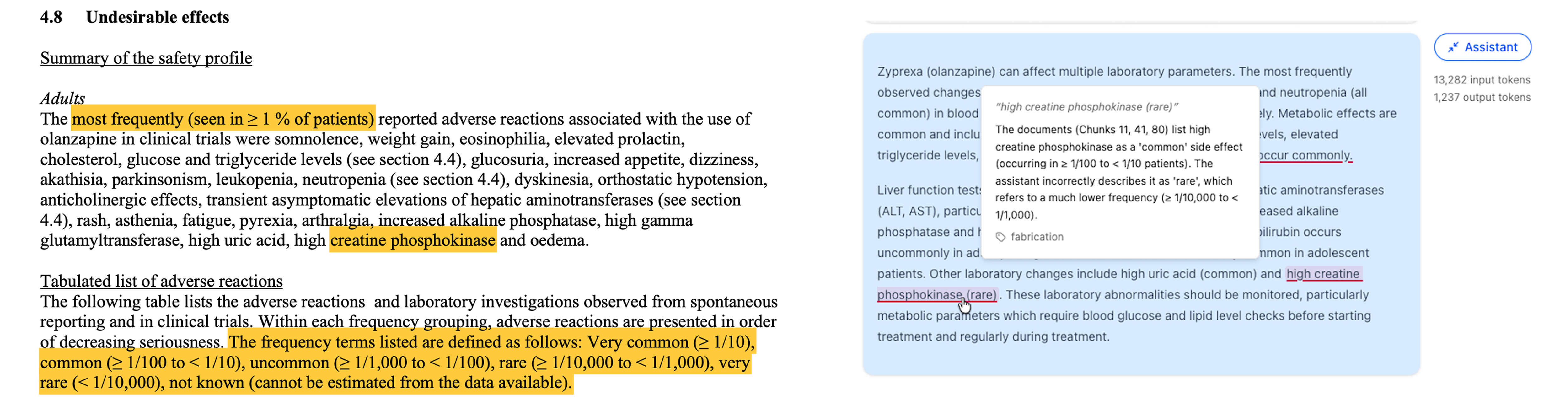 While the acceptability of some hallucinations may depend on the use case, a large share are clearly unacceptable regardless. As shown in the example below, models frequently reported incorrect frequencies for side effects. Reporting a rare side effect as common, or vice versa, can severely impact clinical decision-making.